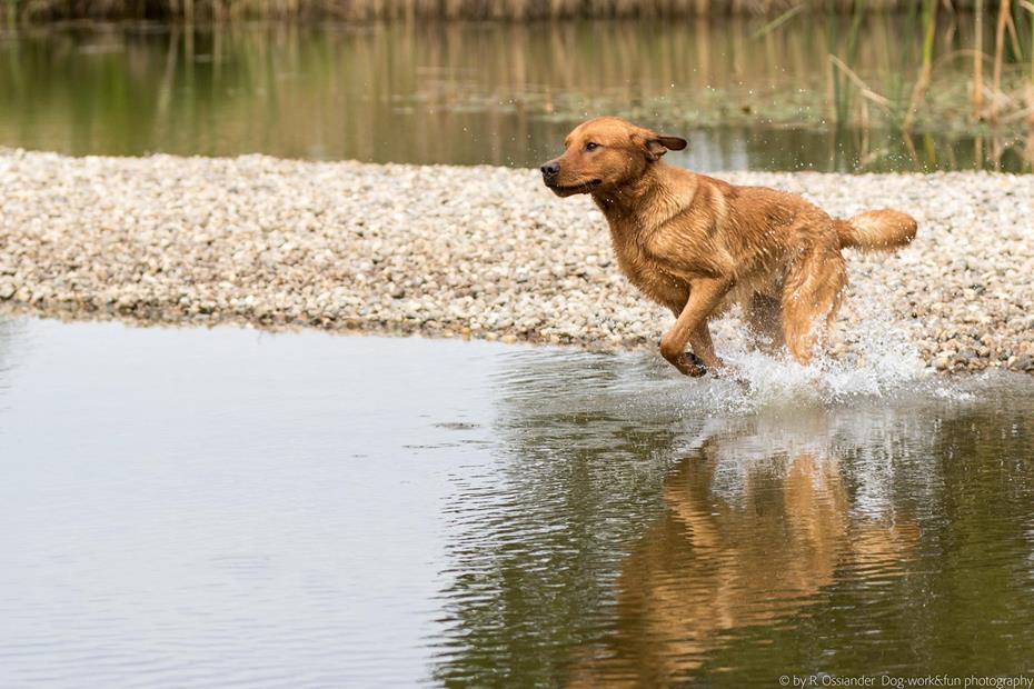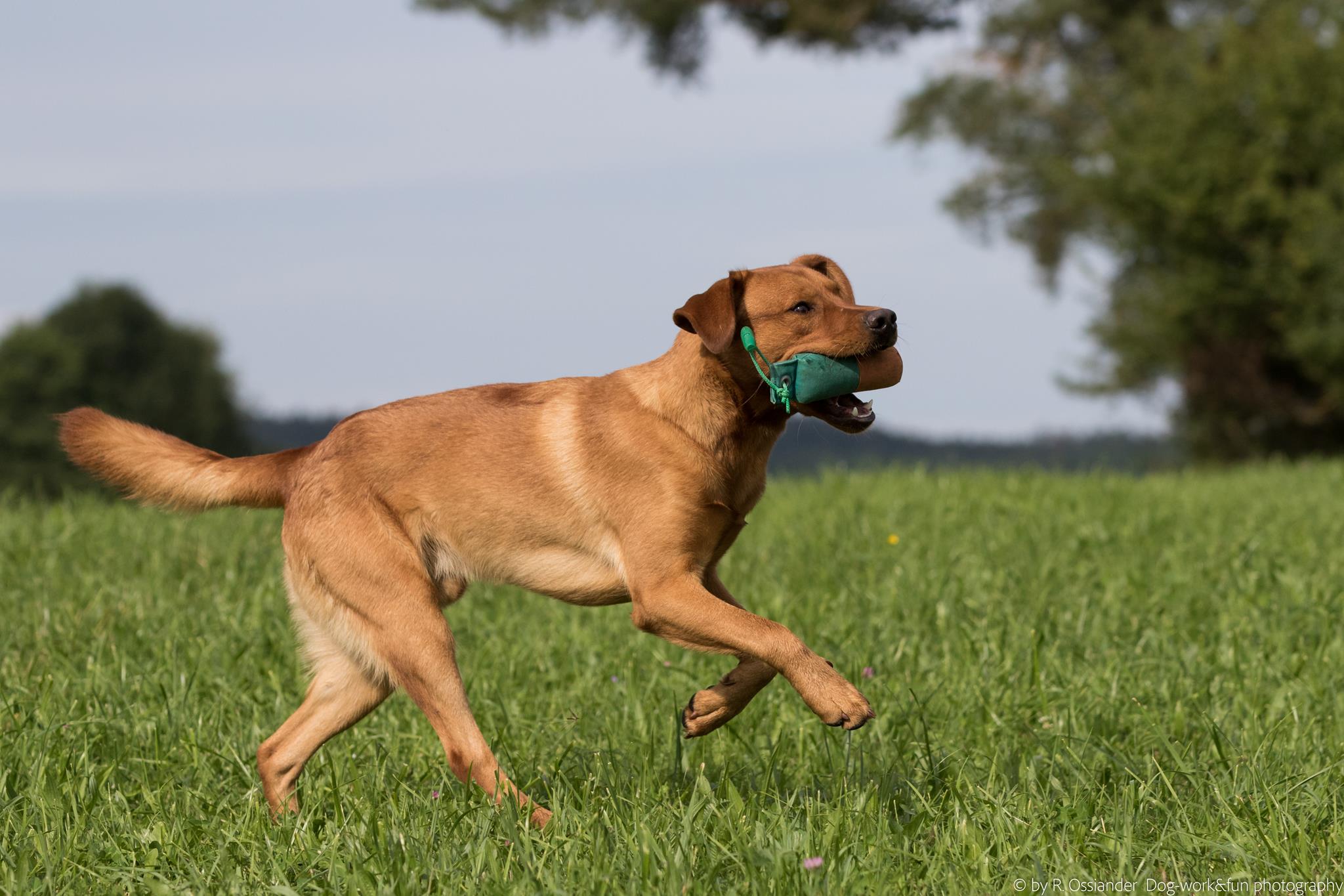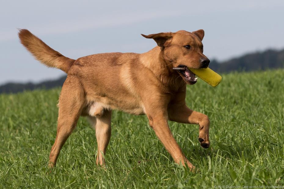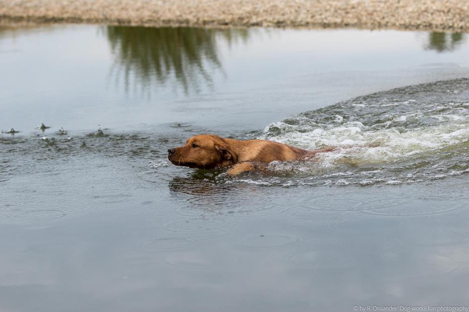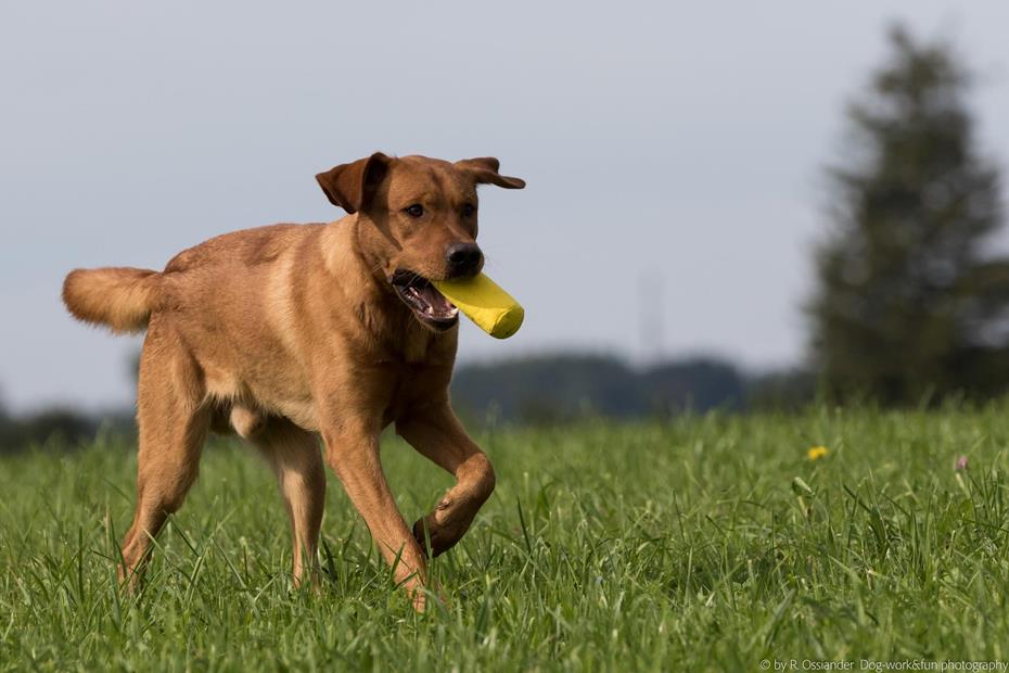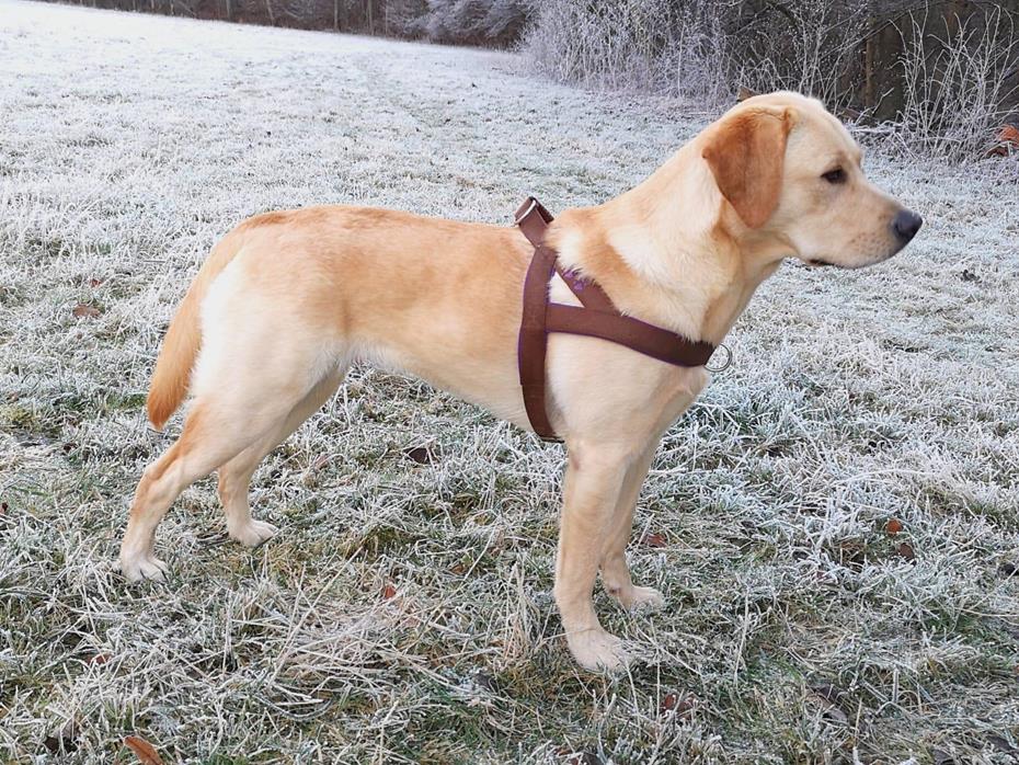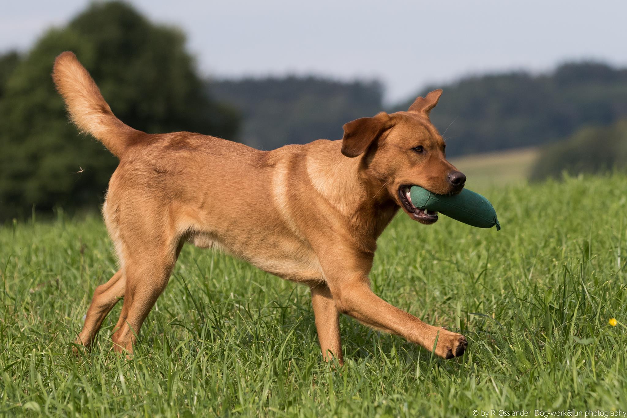 Ein ruhiger, ausgeglichener Jungrüde mit sehr ansprechendem Kopf, ovale dunkelbraune Augen, braun-schwarzer Nasenspiegel mit freundlichem Gangwerk und ausgeprägter Otterrute.