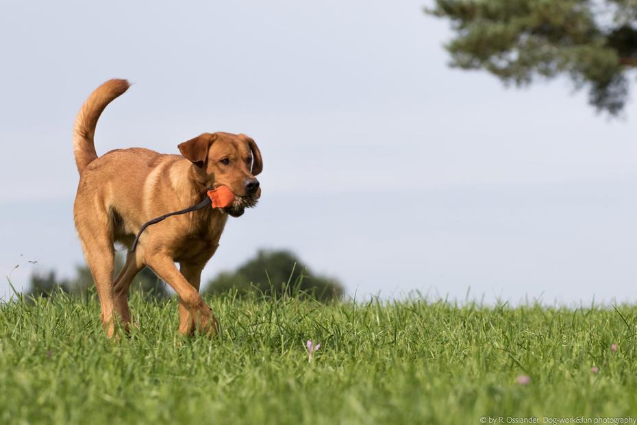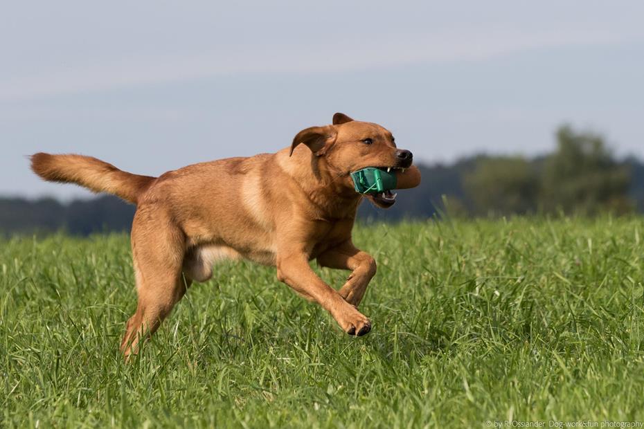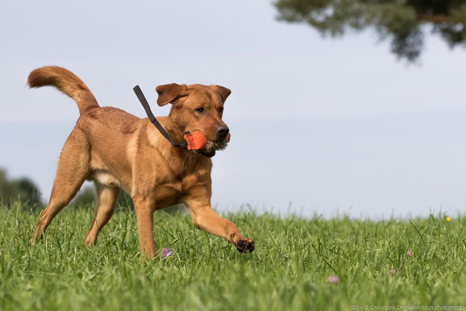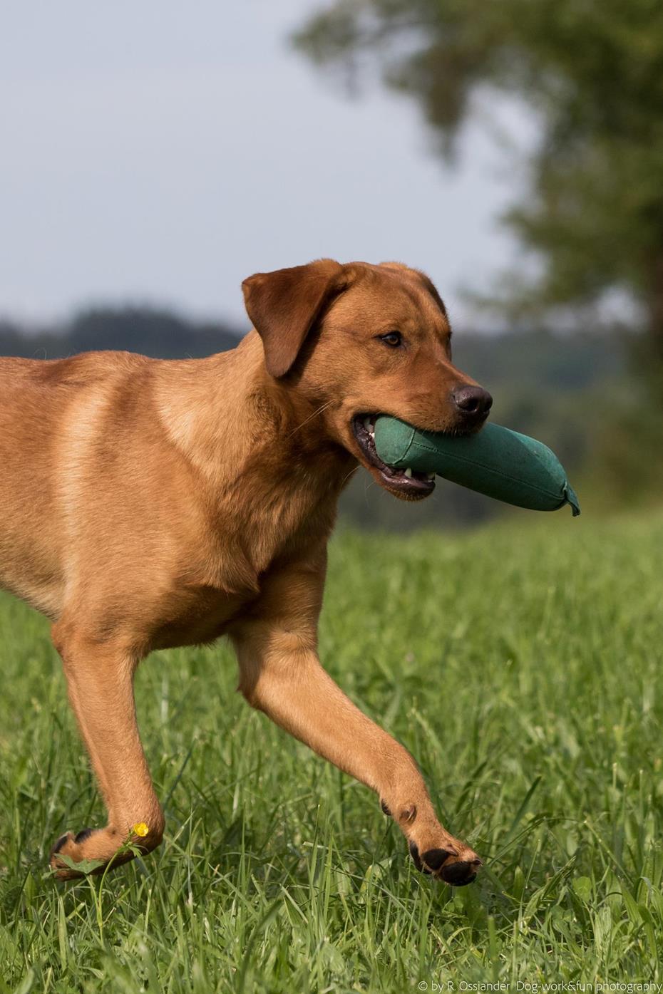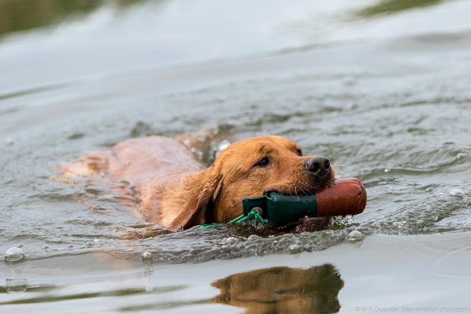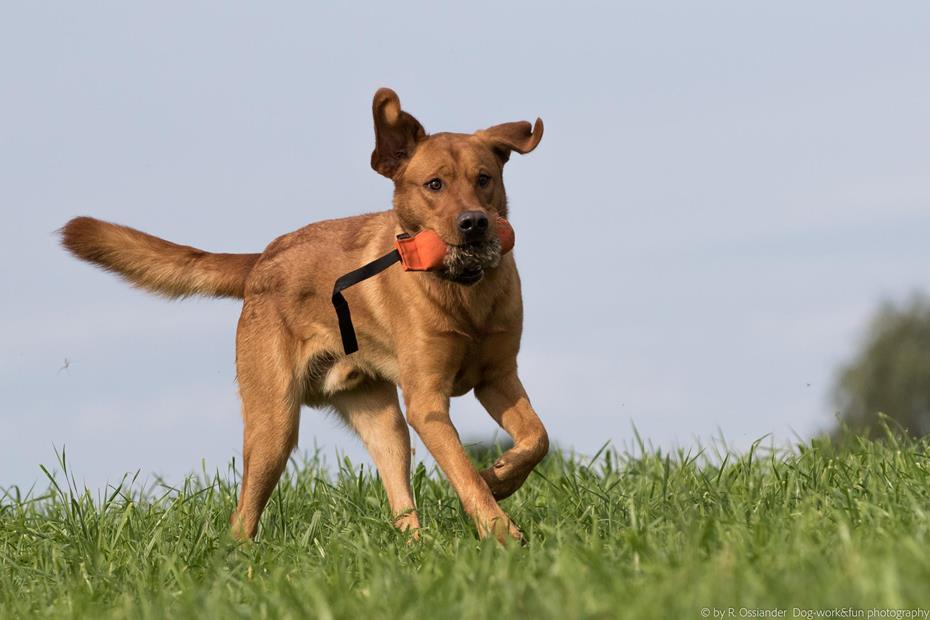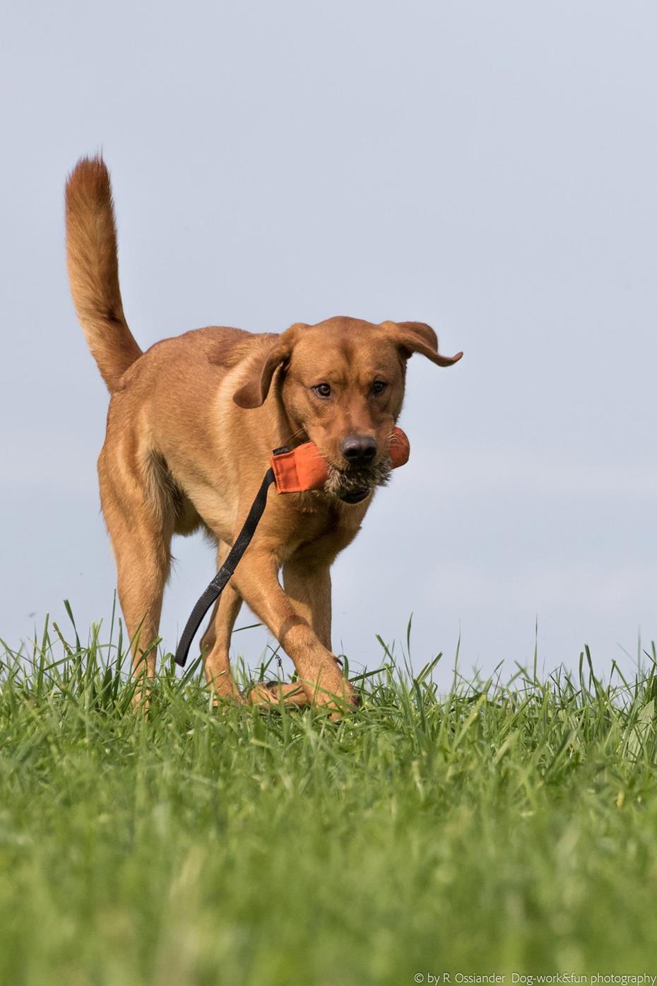 Cain ist ein sehr charmanter, freundlicher Rüde mit einem ausgeprägtem 'will to please'. Wenn wir unterwegs sind, entfernt er sich nie weiter wie fünf Meter, überwiegend direkt um meine Beine, außer er ist im Spiel mit seinen Gefährten. Ein extrem leicht führiger Rüde, der auch absolut keinen Ärger will. Sobald er merkt, einer ist ihm nicht wohlgesonnen, weicht er sofort zurück. Sein Apportiertrieb ist sehr gut ausgeprägt, nicht nur auf die Dummies, am Liebsten würde er mir alles bringen was er findet. In der Arbeitsauführung ist er sehr ruhig, mit Begeisterung dabei.