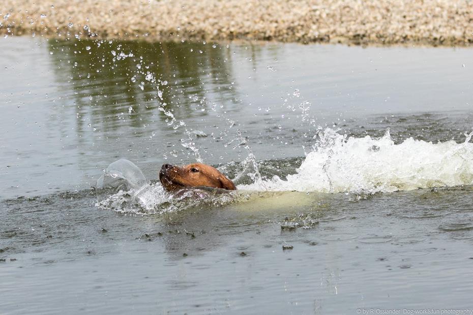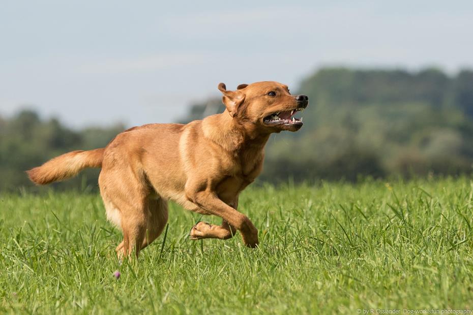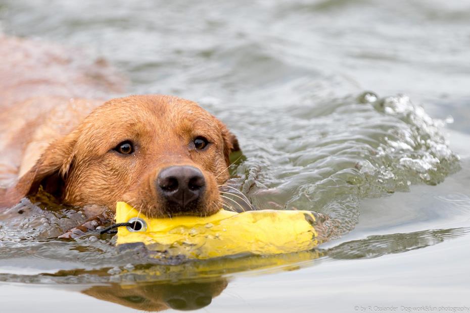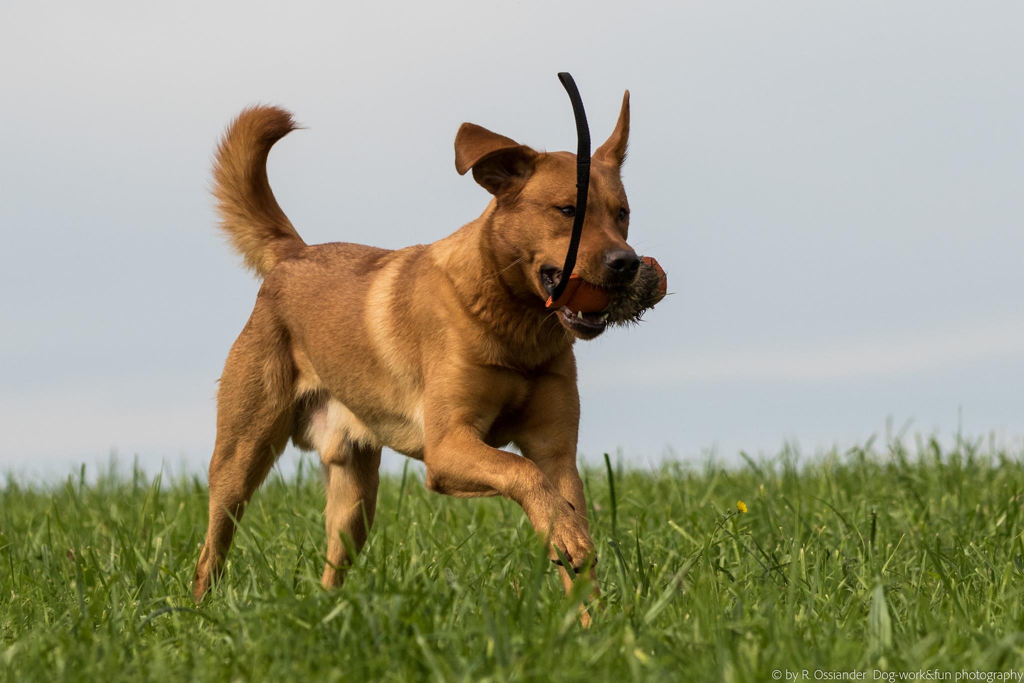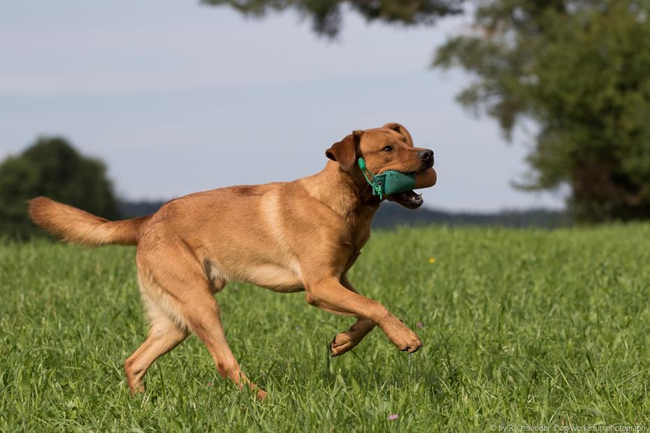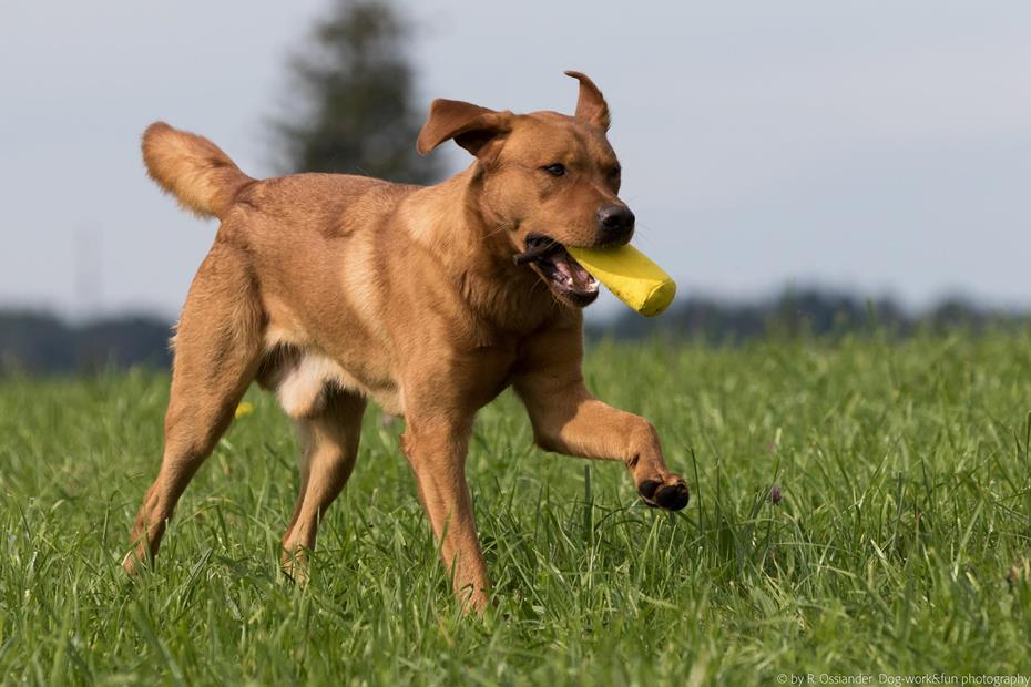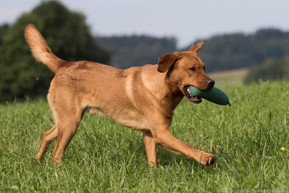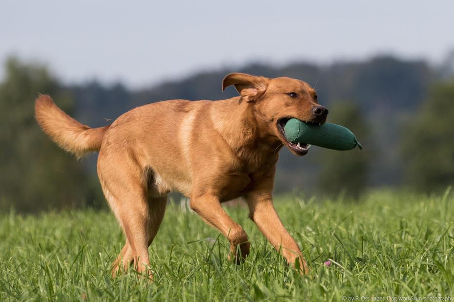 Cain ist ein sehr charmanter, freundlicher Rüde mit einem ausgeprägtem 'will to please'. Wenn wir unterwegs sind, entfernt er sich nie weiter wie fünf Meter, überwiegend direkt um meine Beine, außer er ist im Spiel mit seinen Gefährten. Ein extrem leicht führiger Rüde, der auch absolut keinen Ärger will. Sobald er merkt, einer ist ihm nicht wohlgesonnen, weicht er sofort zurück. Sein Apportiertrieb ist sehr gut ausgeprägt, nicht nur auf die Dummies, am Liebsten würde er mir alles bringen was er findet. In der Arbeitsauführung ist er sehr ruhig, mit Begeisterung dabei.