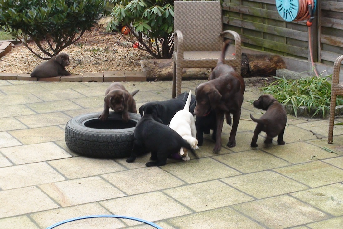 Ab der 3. bis 4. Woche werden sie langsam von Muttermilch (was unsere Hündin genügend hat) umgestellt auf Festnahrung. Sie bekommen jetzt auch Spielzeug und wir spielen jetzt ganz gezielt mit ihnen. Im Garten lernen sie die verschiedensten Dinge kennen: Wiese, Pflastersteine, Büsche und Bäume, Spieltunnel, Bällebad, Sand und vieles mehr.